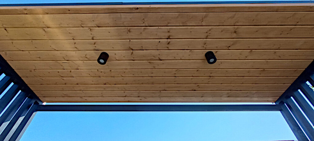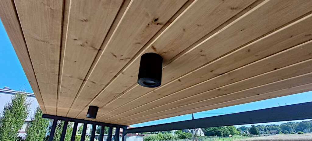 Wiata kuchenna wykonana jest w całości z certyfikowanego drewna konstrukcyjnego C24 z sufitem obitym wysokogatunkową boazerią wykonaną ze świerku skandynawskiego.