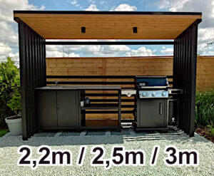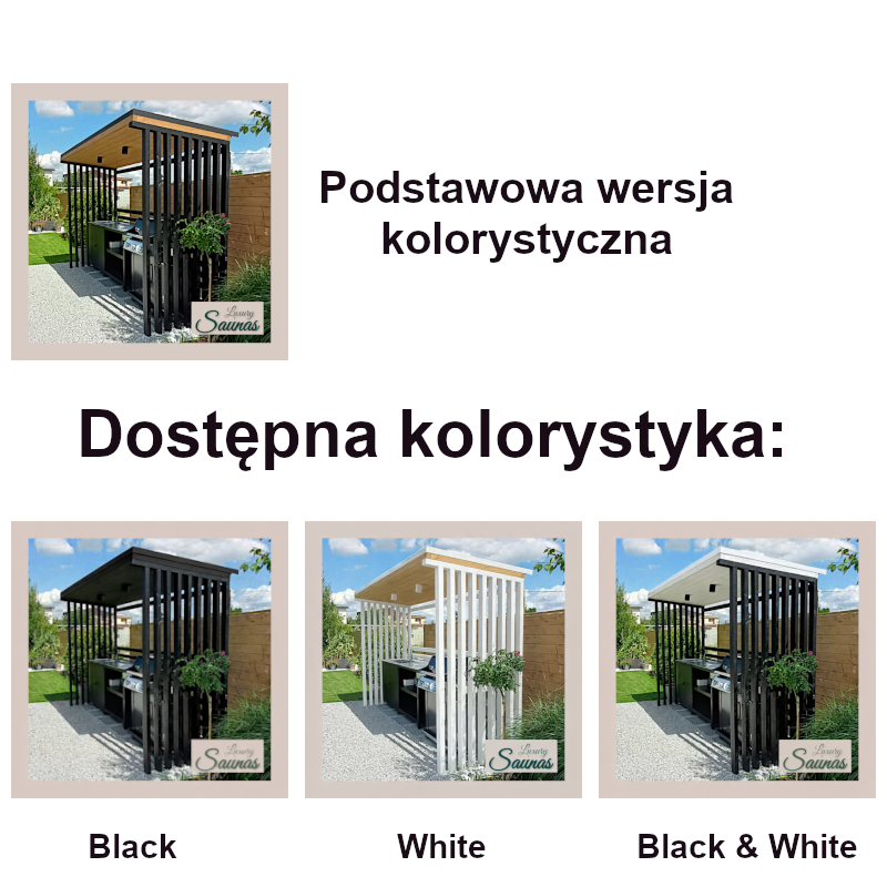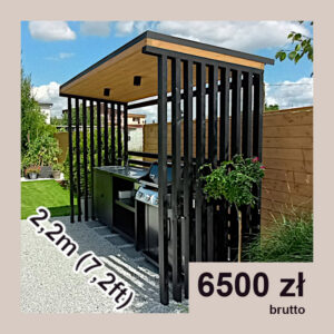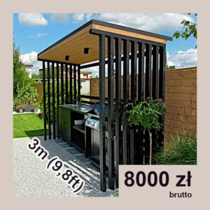 Widoczne na zdjęciach wyposażenie w postaci grilla oraz mebli, nie wchodzi w skład oferty. Istnieje możliwość wyposażenia oraz dostosowania wiaty kuchennej na wymiar, lub zaprojektowania od podstaw wraz z montażem. W tym celu zapraszamy do kontaktu.
