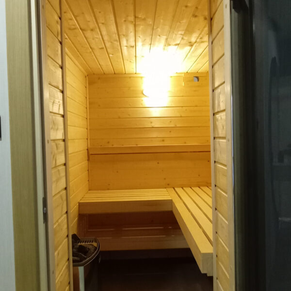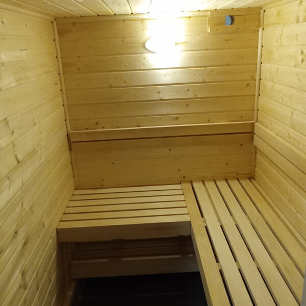 Sauna wewnętrzna o wymiarach zewnętrznych 1,6m x 2m.